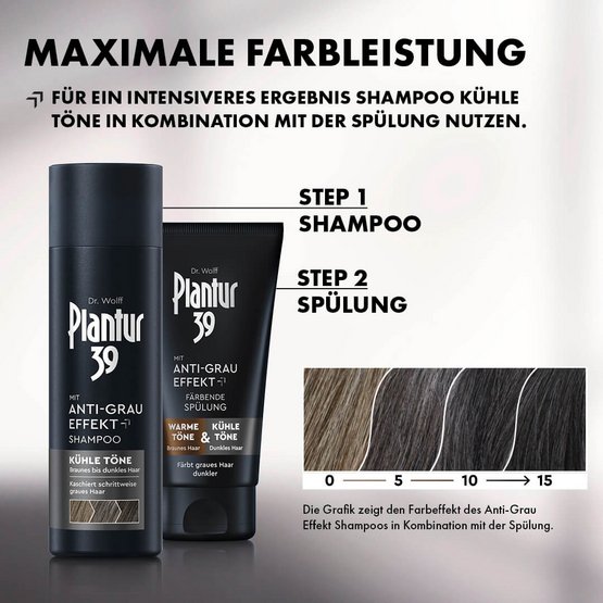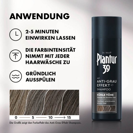 Entdecke die einfache, schonende und effektive Lösung für graue Haare mit dem Plantur 39 Anti-Grau Effekt Shampoo Kühle Töne, das speziell für braune bis dunkle Haartöne geeignet ist. Das Farbergebnis wird mit jeder Haarwäsche intensiver. Erste graue Strähnen werden ebenso kaschiert wie ein erst entstehender grauer Ansatz. Das Ergebnis ist natürliches, dauerhaft dunkleres Haar mit einer kühlen Farbnuance.