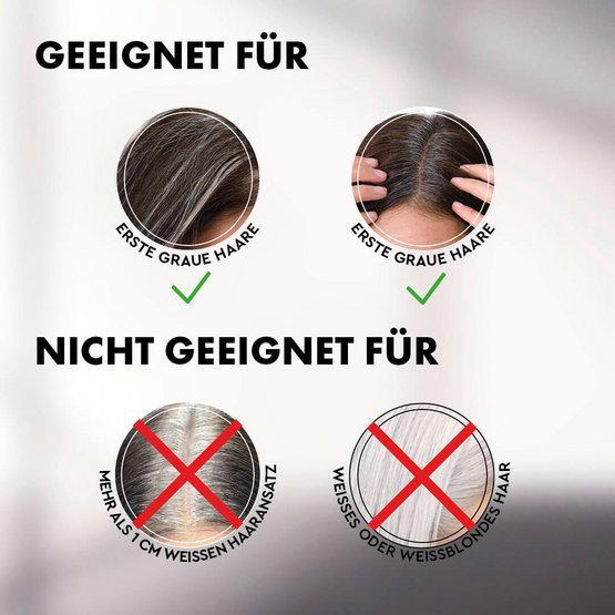 Geeignet für braunes bis dunkles Haar. Bei komplett weißem Haar oder einem weißen Ansatz >1cm nur bedingt geeignet.