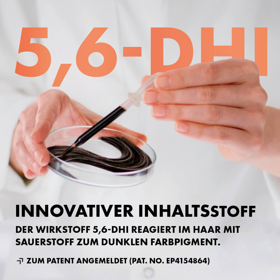 Das Geheimnis liegt in der innovativen Repigmentierungs-Technologie, die auf einem zum Patent angemeldeten Wirkprinzip basiert. Bei jeder Haarwäsche lagert sich der Inhaltsstoff 5,6-DHI im Haar an und geht eine sanfte Reaktion mit dem Sauerstoff in der Luft ein, wodurch Farbpigmente entstehen, die mit dem Haar herauswachsen. Das Haar wird nach und nach dunkler und graue Haare werden kaschiert – ganz einfach bei der Haarwäsche.
